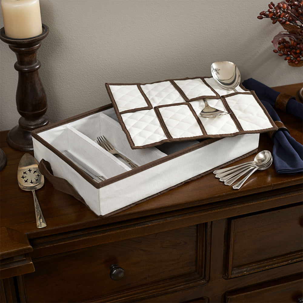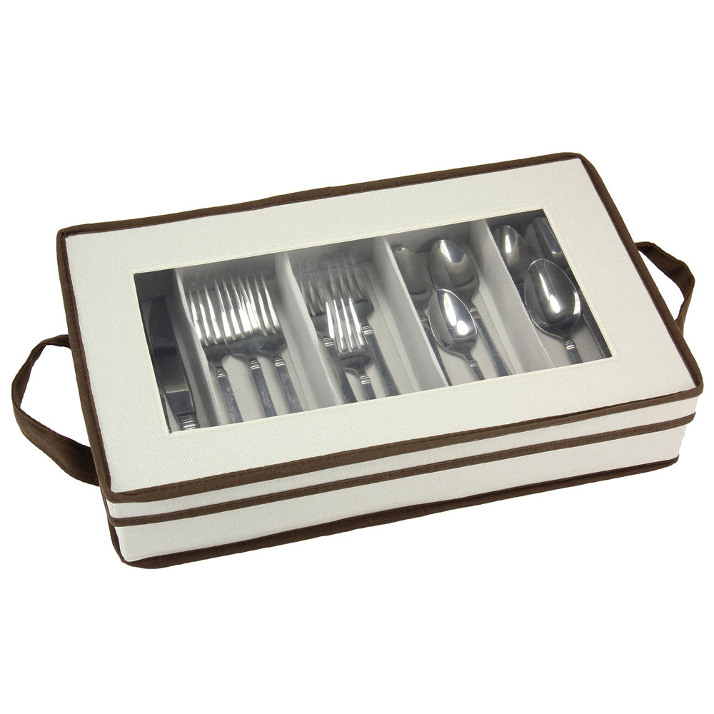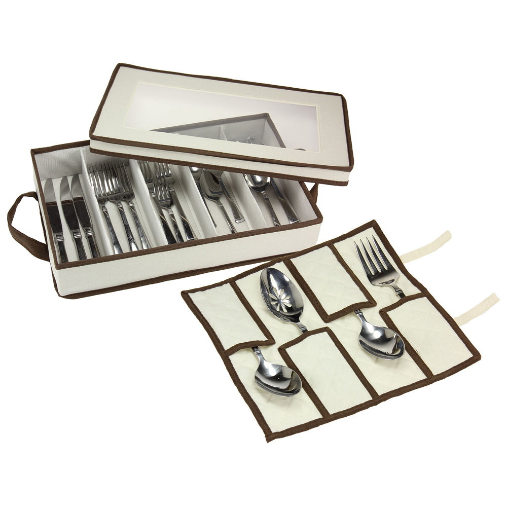 The Flatware Storage Box with Serving Pouch is designed to keep your good silverware safely stored in the china hutch. The storage box features five spacious compartments for ample storage space. The removable lid has a clear window so you can easily see the contents stored inside. Riveted handles for easy transportation.