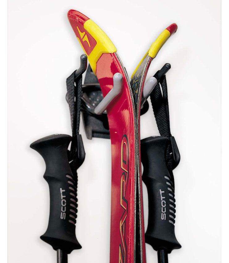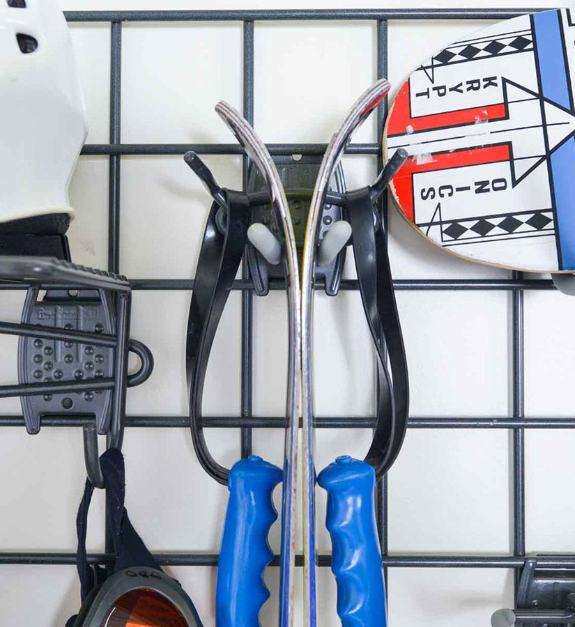 Store skis on your garage storage grid or Storwall with this sturdy Garage Grid Ski Storage Rack. This ski storage hook features sturdy steel construction with a protective non-slip foam rubber coating to protect skis and is designed to accommodate one pair of skis. one set of ski poles. goggles. and other accessories can also be mounted directly to walls in your garage. closet. or basement.