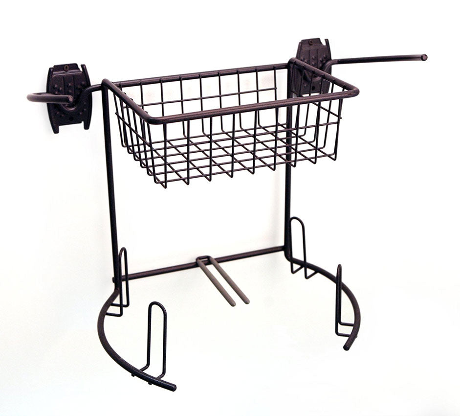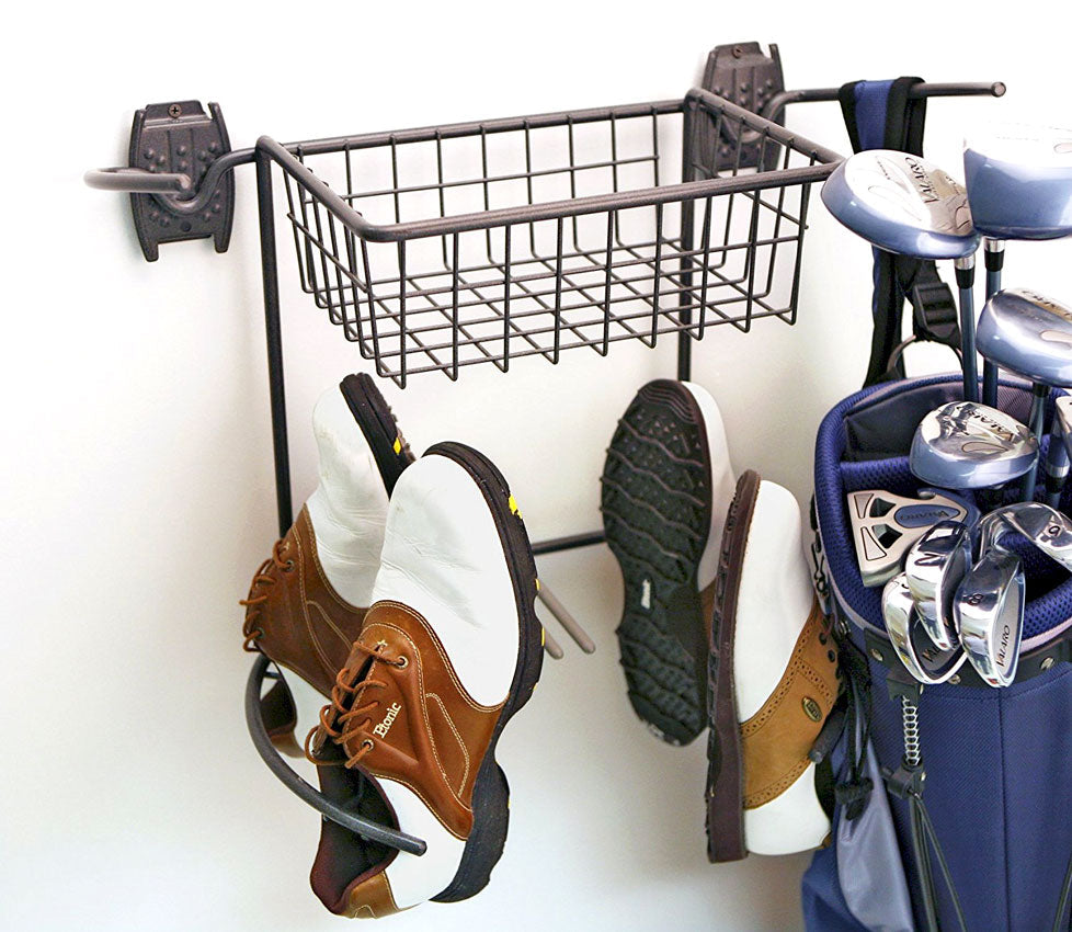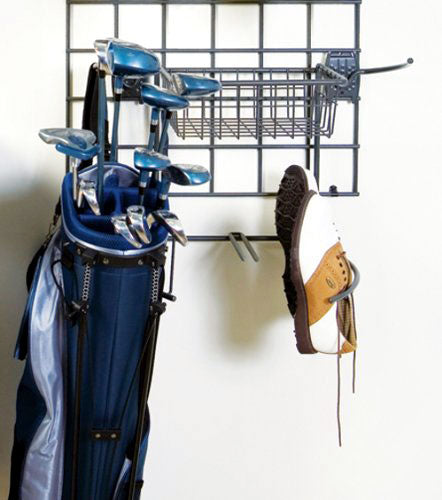 Tired of your golf bag being in the way or being knocked over? The Golf Storage Rack and Basket is designed to hold a pair of golf bags. two pair of golf shoes. plus all your golf gear and accessories. This golf bag storage rack mounts onto the Garage Grid or Garage Heavy Duty StoreWall storage systems without the need for tools. The golf rack can also be mounted directly to the wall. The wall mounted golf bag storage rack features a durable epoxy coating in a granite finish. and provides storage for all your golf equipment in one convenient location.