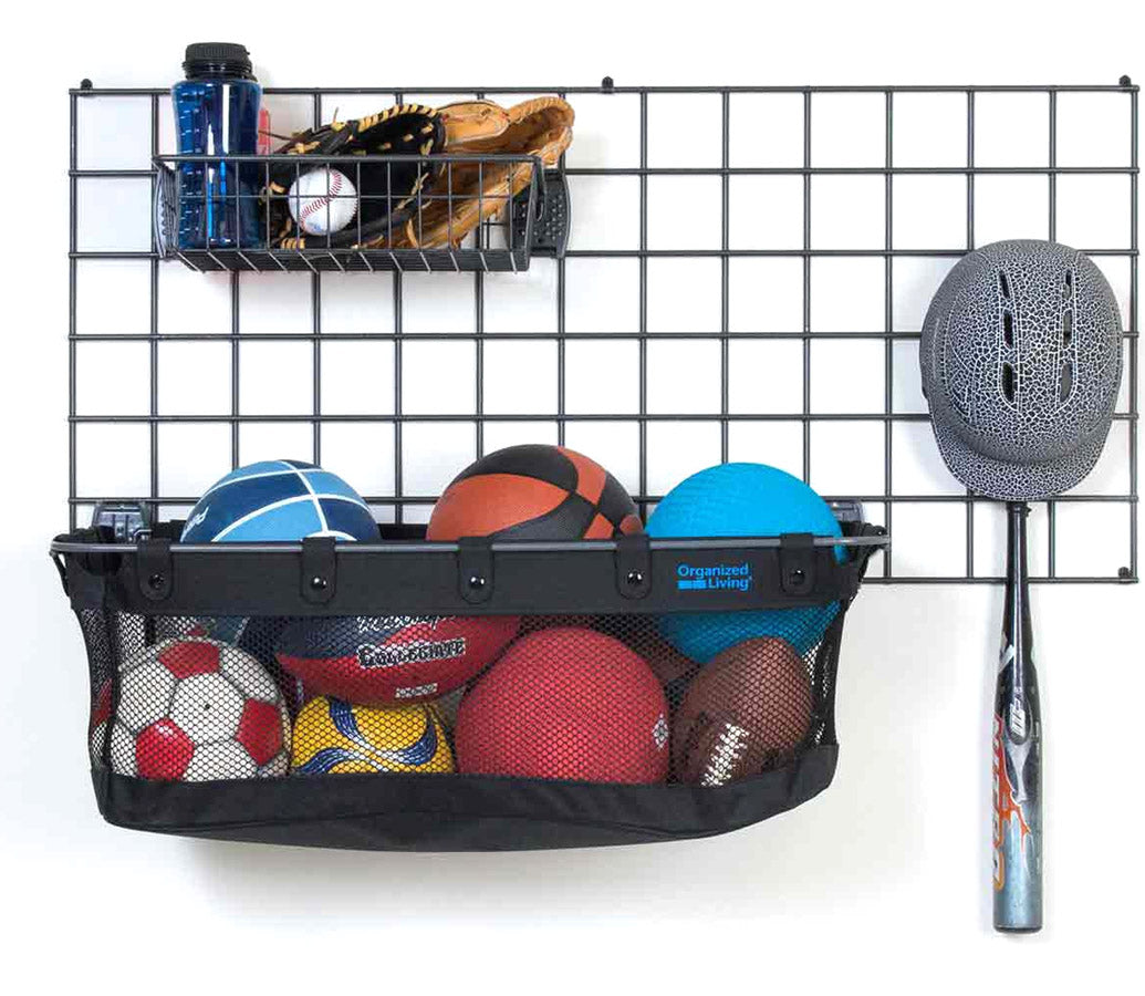 Gather up sporting goods and outdoor toys and keep the organized in the Grid or Wall Mount Mesh Sports Storage Basket. Offering space to store up to ten standard sports balls. this mesh storage bin can mount onto a Heavy Duty Garage Grid. StorWall Panel or directly onto a wall to help keep the garage neat and organized. 75 pound weight capacity.
