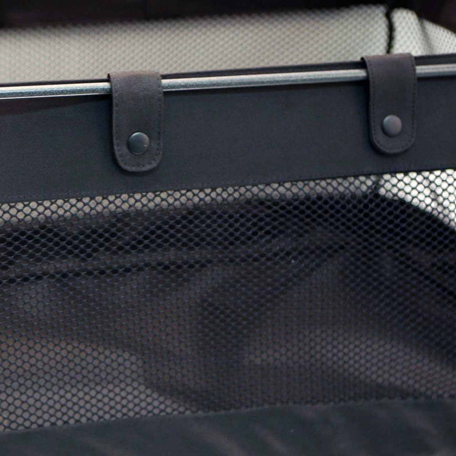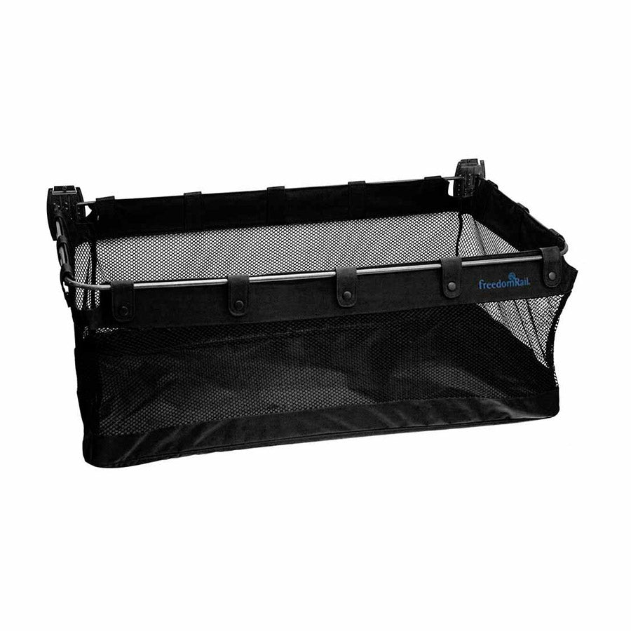 - Durable black mesh storage basket has a canvas reinforced top and bottom