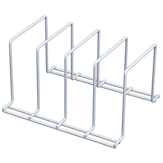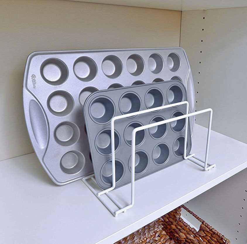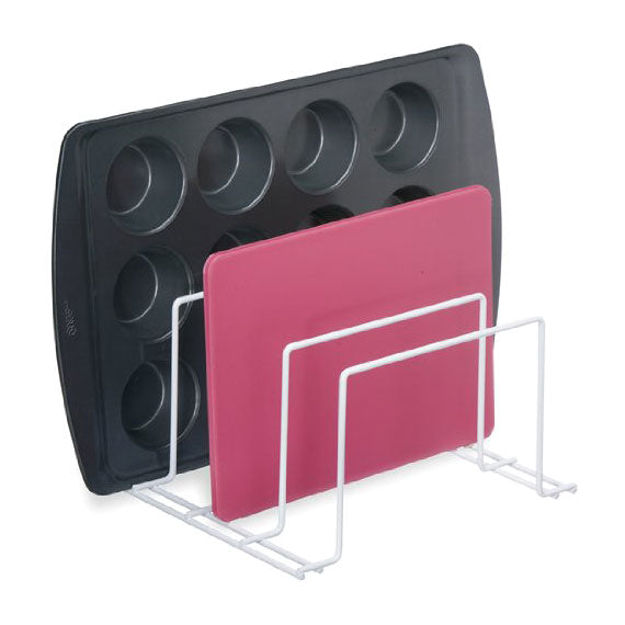 Maximize storage space in kitchen cabinets and make baking sheets. cupcake pans. and other bakeware items easily accessible with this Wire Bakeware Rack. This bakeware organizer is constructed from heavy-duty metal wire and features four 2-1/4 inch slots that are great for storing cookie sheets. muffin pans. cutting boards. and more.